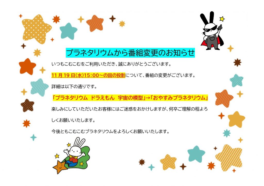 プラネタリウムから番組変更のお知らせ 11月19日(水)15:00~の回の「プラネタリウム ドラえもん 宇宙の模型」が「おやすみプラネタリウム」 に変更となります。 今後ともこむこむプラネタリウムをよろしくお願いいたします。 Twitter Facebook LINE