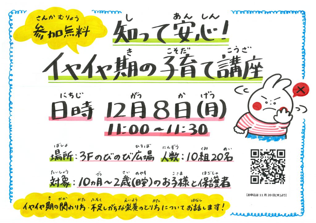 知って安心!イヤイヤ期の子育て講座 日時 2025年12月8日(月曜日) 午前11時00分から午前11時30分 対象 10か月から2歳(目安)のお子様と保護者様 会場 こむこむ館3階のびのび広場 申込方法 11月20日(木曜日)午前9時30分より申込開始 申込はこちらから ※申込フォーム作成中 Twitter Facebook LINE