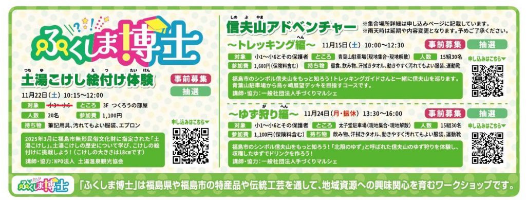 ※「土湯こけし絵付け体験」は、対象学年を小学1年生~一般までに変更しました。(小学1~2年生は必ず保護者同伴お願いします)