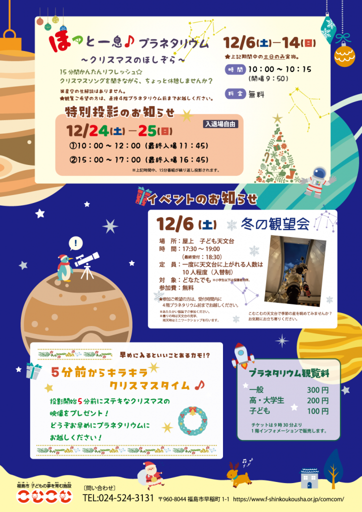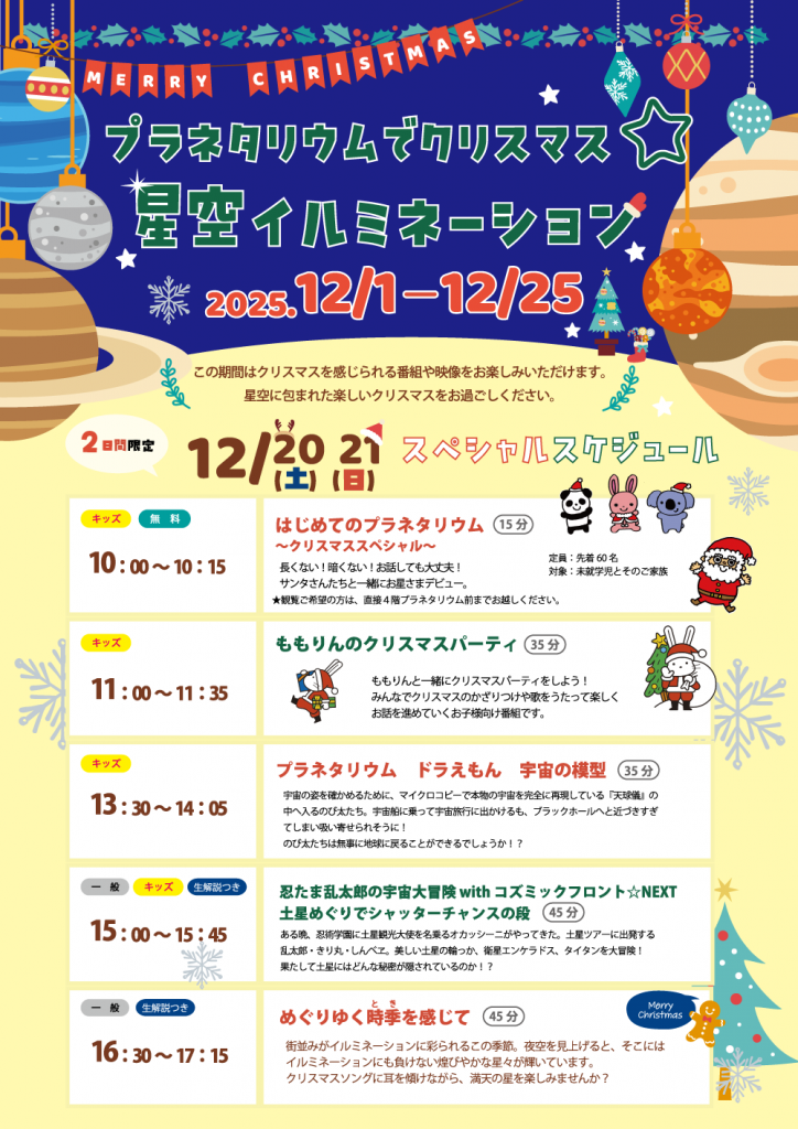 プラネタリウムでクリスマス☆星空イルミネーション(令和7年12月1日~12月25日) この期間はクリスマスを感じられる番組や映像をお楽しみいただけます。星空に包まれた楽しいクリスマスをお過ごしください。 Twitter Facebook LINE