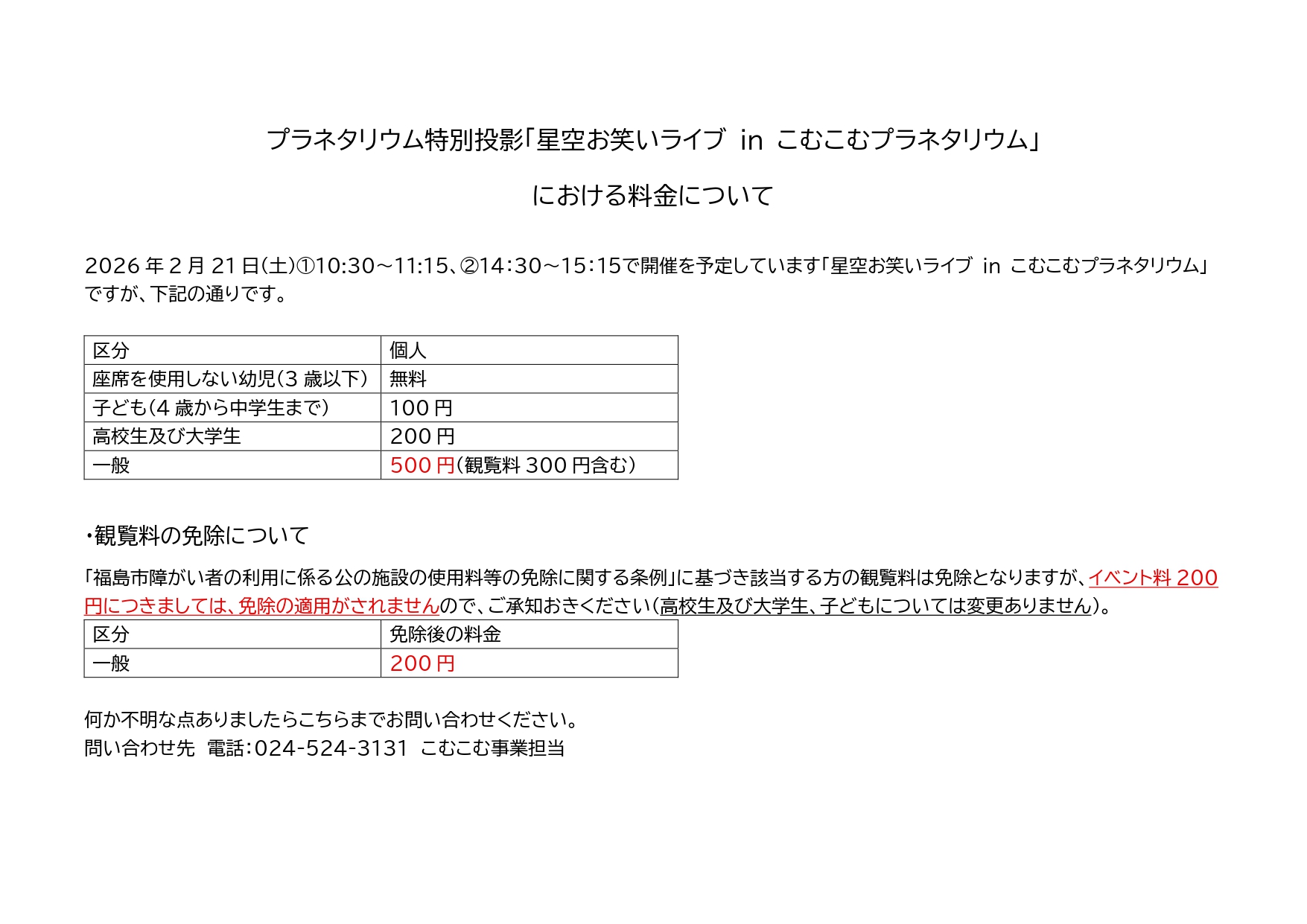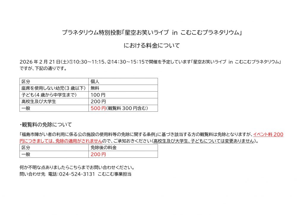 プラネタリウム特別投影「星空お笑いライブ in こむこむプラネタリウム」における料金について