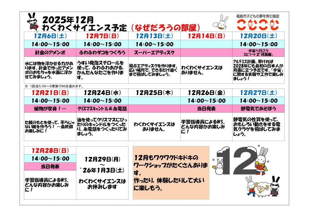 わくわくサイエンス(令和7年12月) 毎回違ったテーマで実験をおこないます。科学のふしぎに触れてみよう。 日にち:土曜日・日曜日・祝日など 時間:午後2時から午後3時まで 参加できる人:どなたでも(小学2年生以下は保護者同伴) 場所:3階 なぜだろうの部屋 定員:6から9家族(材料に限りがある場合があります) 費用:無料 もらえるポイント:0ポイント 用意するもの:ありません Twitter Facebook LINE