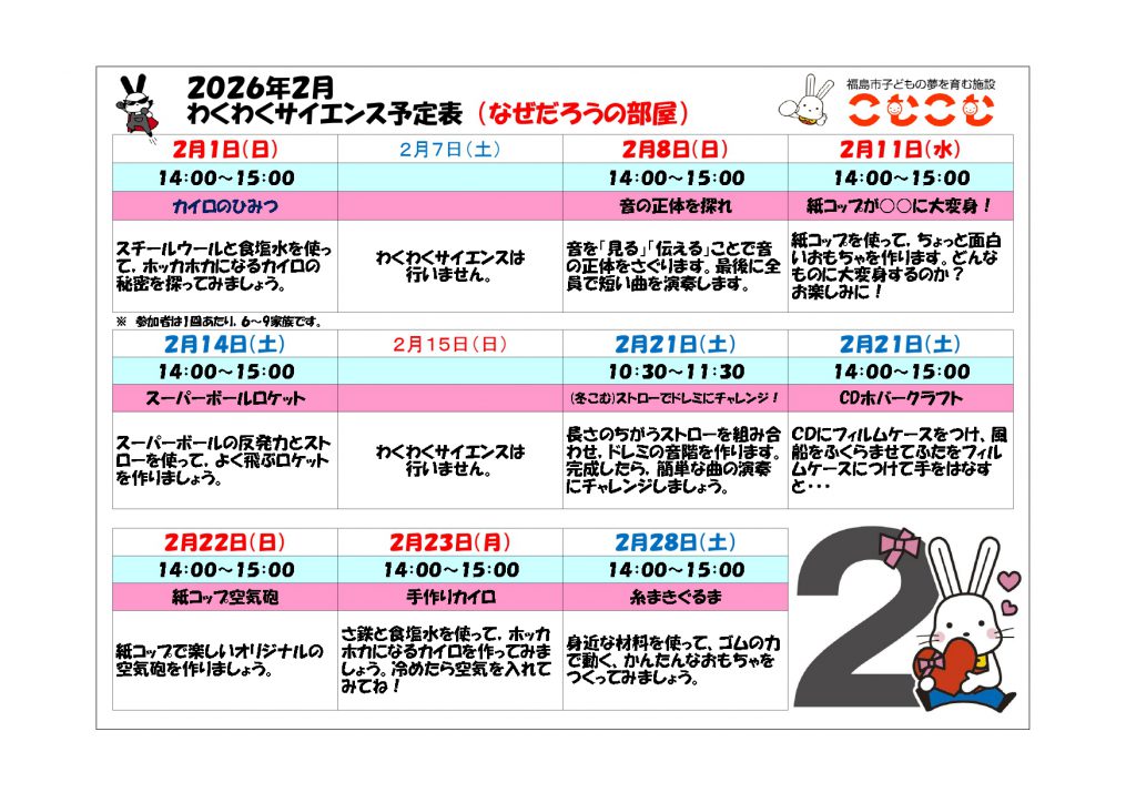 わくわくサイエンス(令和8年2月) 毎回違ったテーマで実験をおこないます。科学のふしぎに触れてみよう。 日にち:土曜日・日曜日・祝日など 時間:午後2時から午後3時まで 参加できる人:どなたでも(小学2年生以下は保護者同伴) 場所:3階 なぜだろうの部屋 定員:6から9家族(材料に限りがある場合があります) 費用:無料 もらえるポイント:0ポイント 用意するもの:ありません Twitter Facebook LINE