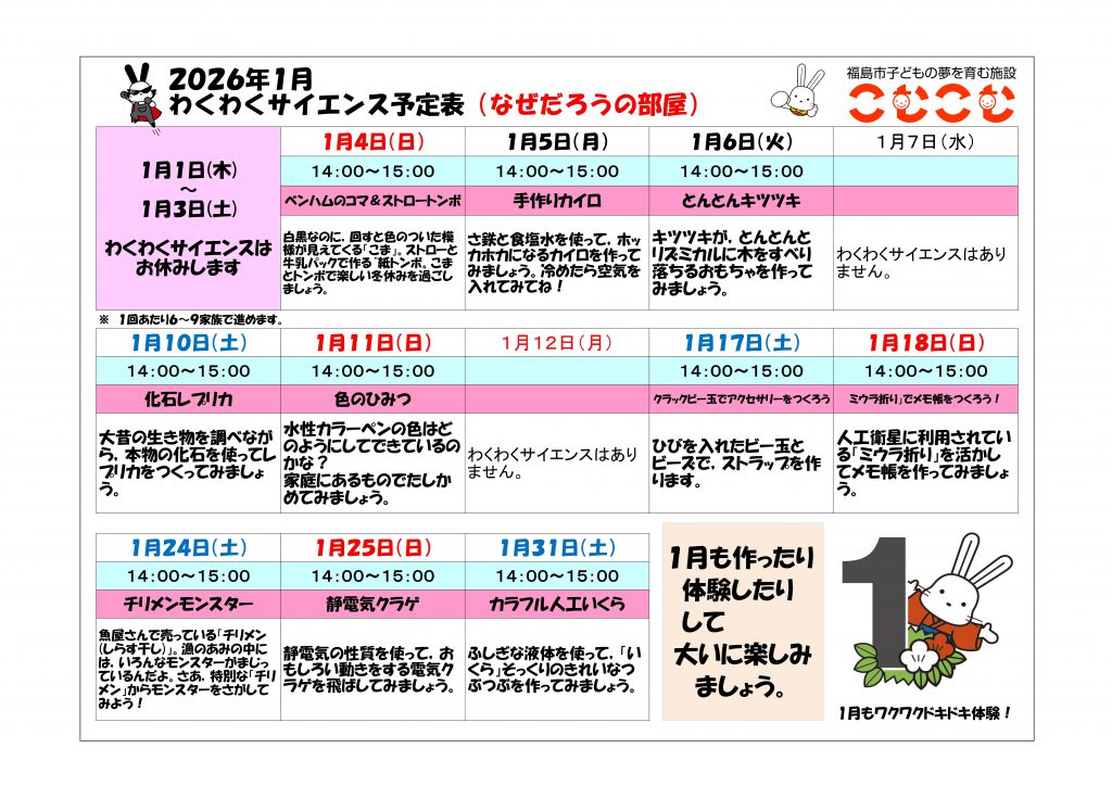 わくわくサイエンス(令和8年1月) 毎回違ったテーマで実験をおこないます。科学のふしぎに触れてみよう。 日にち:上記別表の通り 時間:午後2時から午後3時まで ※各回30分前より整理券配布 参加できる人:どなたでも(小学2年生以下は保護者同伴) 場所:3階 なぜだろうの部屋 定員:6~9家族程度 費用:無料 もらえるポイント:0ポイント 用意するもの:ありません Twitter Facebook LINE
