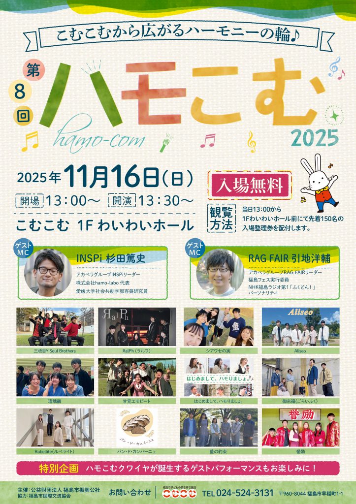第8回ハモこむ こむこむから広がるハーモニーの輪♪ 開催日時 2025年11月16日(日曜日)午後1時30分から 場所 こむこむ館1階わいわいホール 観覧方法 当日午後1時からわいわいホール前にて先着150名の入場整理券を配布いたします。 Twitter Facebook LINE